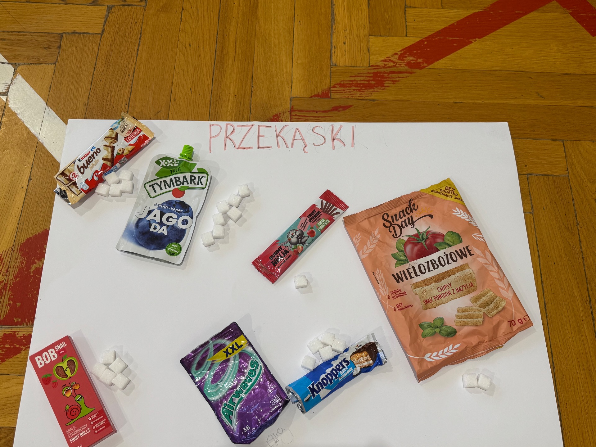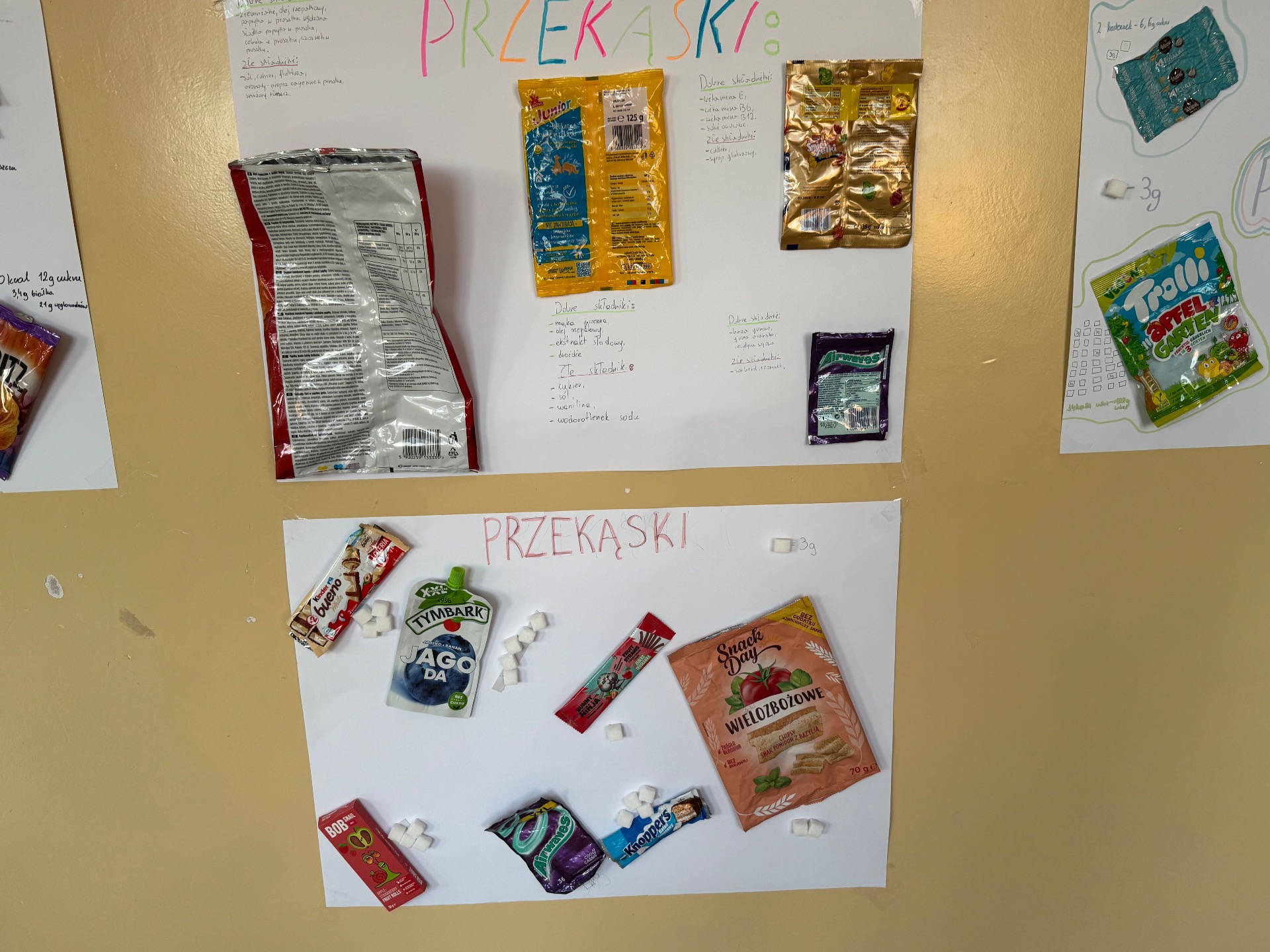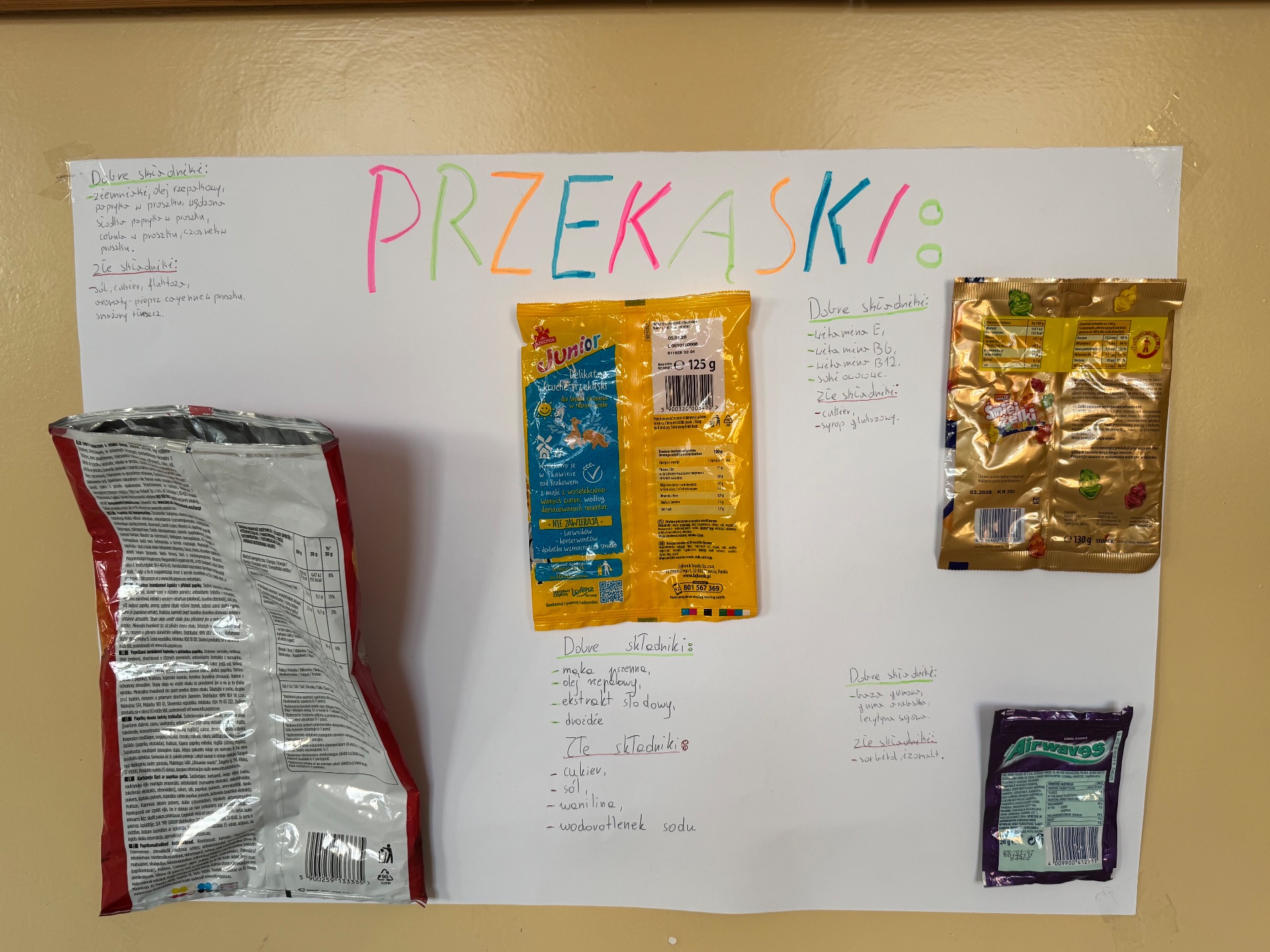Chcemy podzielić się z Wami naszym projektem, który realizowaliśmy na lekcjach wychowania fizycznego w klasach 6, 7 i 8. W ramach projektu postanowiliśmy przeprowadzić małe "śledztwo". Każda grupa wybrała kilka popularnych przekąsek- od chipsów po batony i jogurty. Naszym celem było zrozumienie, jakie przekąski są dla nas zdrowe, a które lepiej omijać szerokim łukiem. Chcieliśmy też dowiedzieć się jakie składniki kryją się w etykietach naszych smakołyków.