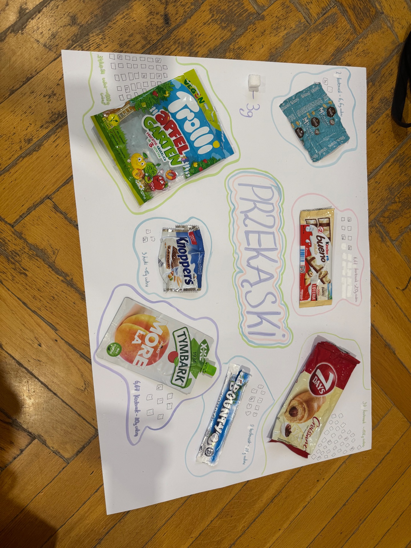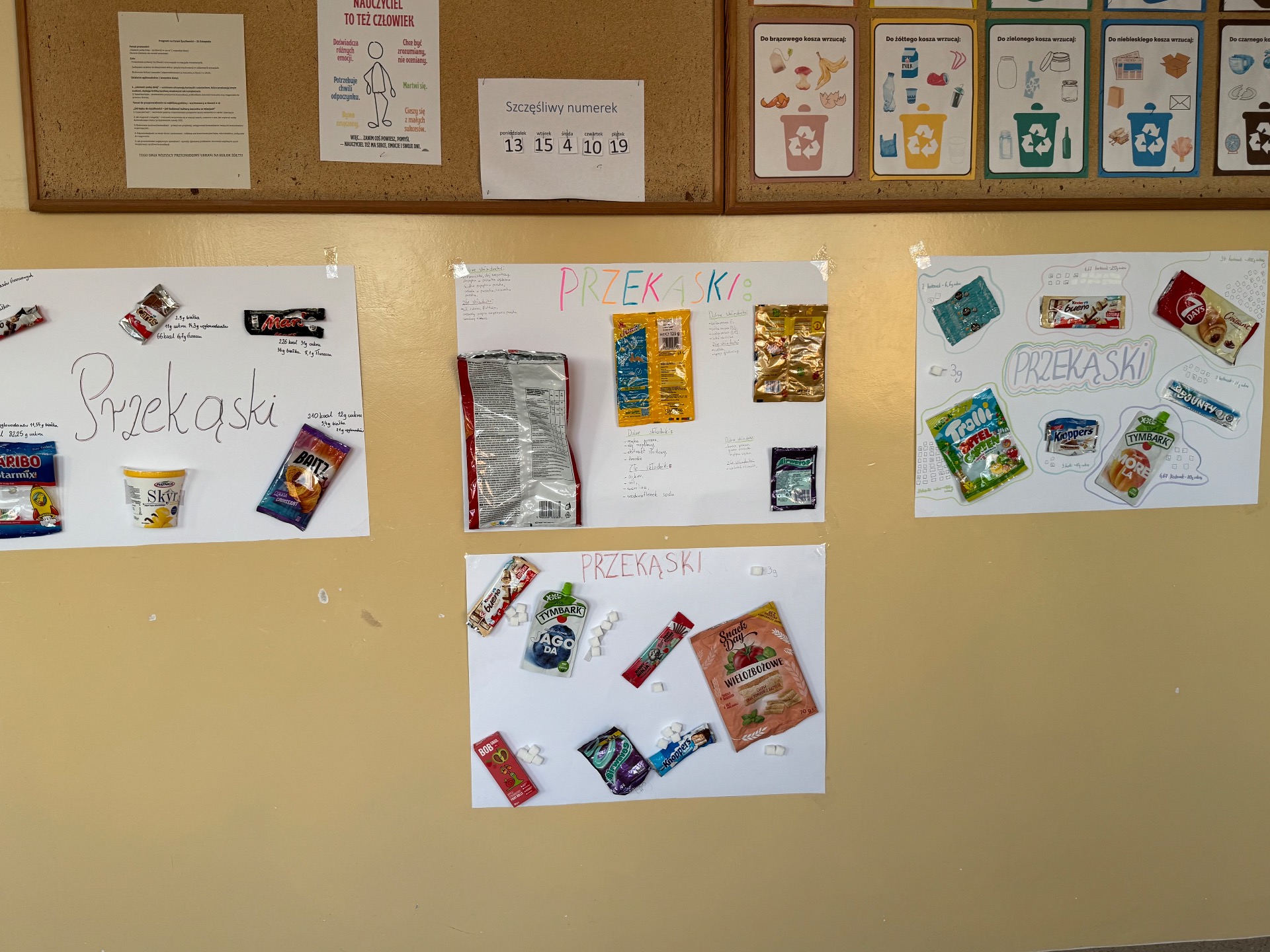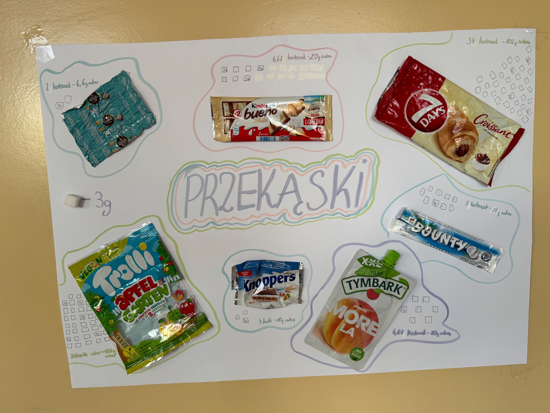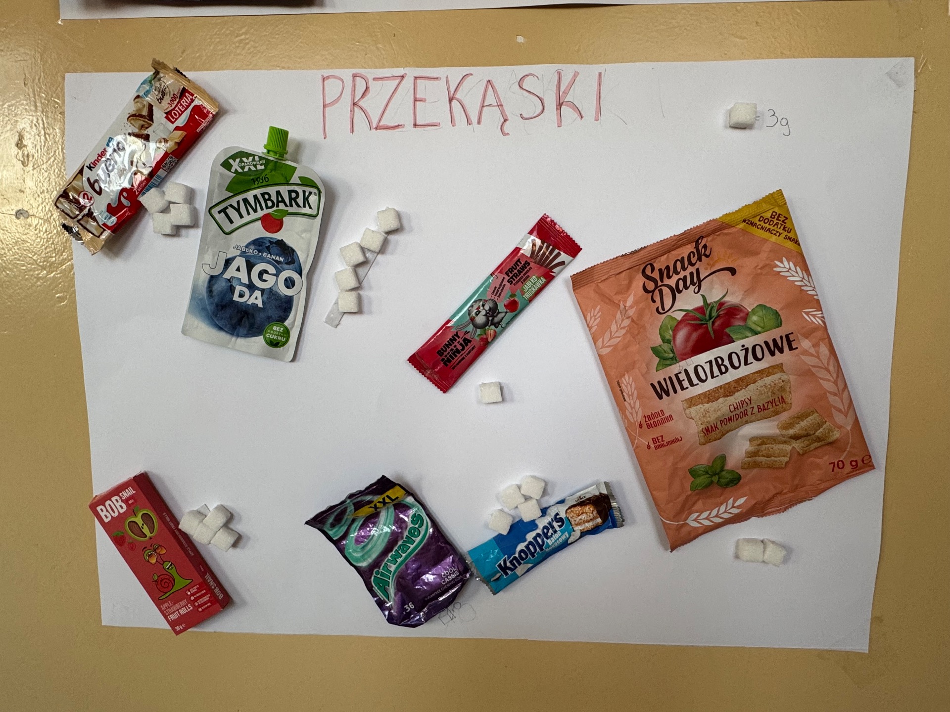 Chcemy podzielić się z Wami naszym projektem, który realizowaliśmy na lekcjach wychowania fizycznego w klasach 6, 7 i 8. W ramach projektu postanowiliśmy przeprowadzić małe "śledztwo". Każda grupa wybrała kilka popularnych przekąsek- od chipsów po batony i jogurty. Naszym celem było zrozumienie, jakie przekąski są dla nas zdrowe, a które lepiej omijać szerokim łukiem. Chcieliśmy też dowiedzieć się jakie składniki kryją się w etykietach naszych smakołyków.