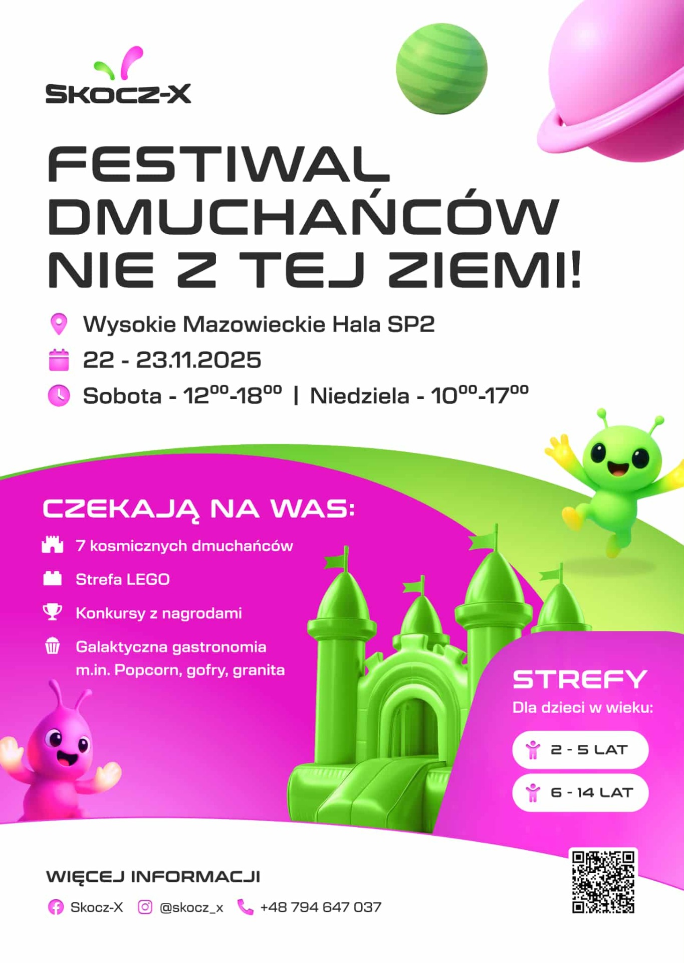 Zwracamy się z uprzejmą prośbą o udostępnienie rodzicom informacji o Festiwalu Dmuchańców – Nie z Tej Ziemi!, który odbędzie się w Wysokiem Mazowieckiem (Hala SP2) w dniach 22–23 listopada 2025 r.