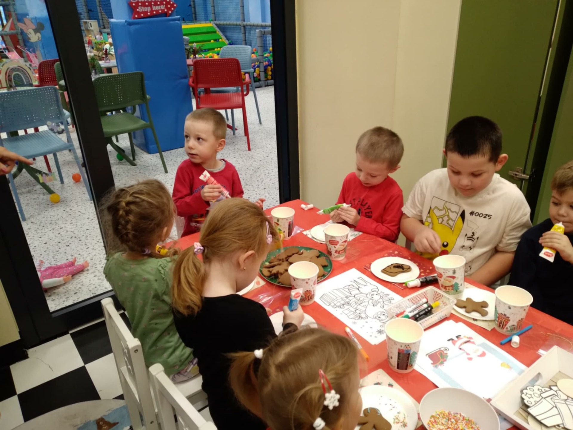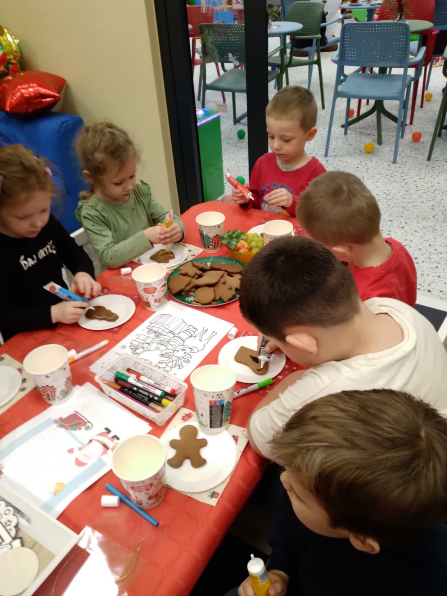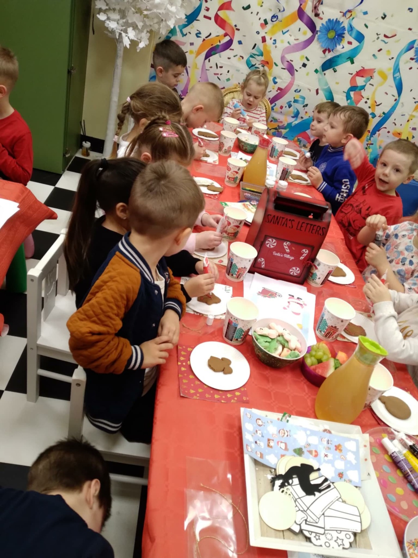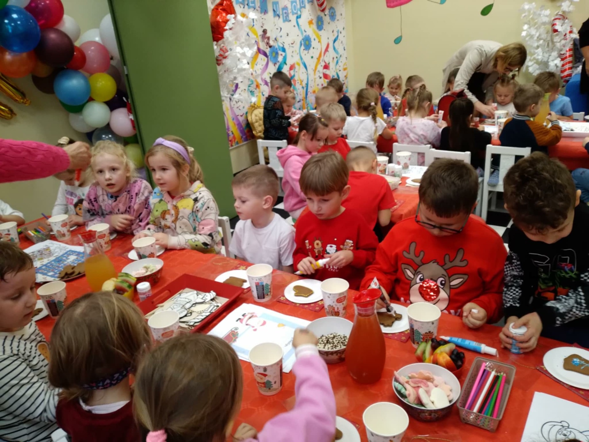 Był to wyjątkowy, pełen radości, zabaw, kreatywności, czas naszej aktywności. Każde dziecko ozdobiło swój własny pierniczek i świąteczną ozdobę oraz otrzymało świąteczny tatuaż brokatowy. Później odbyło się spotkanie z Mikołajem, który wręczył nam prezenty (na szczęście nikt nie dostał rózgi) i ciąg dalszy szalonych zabaw.