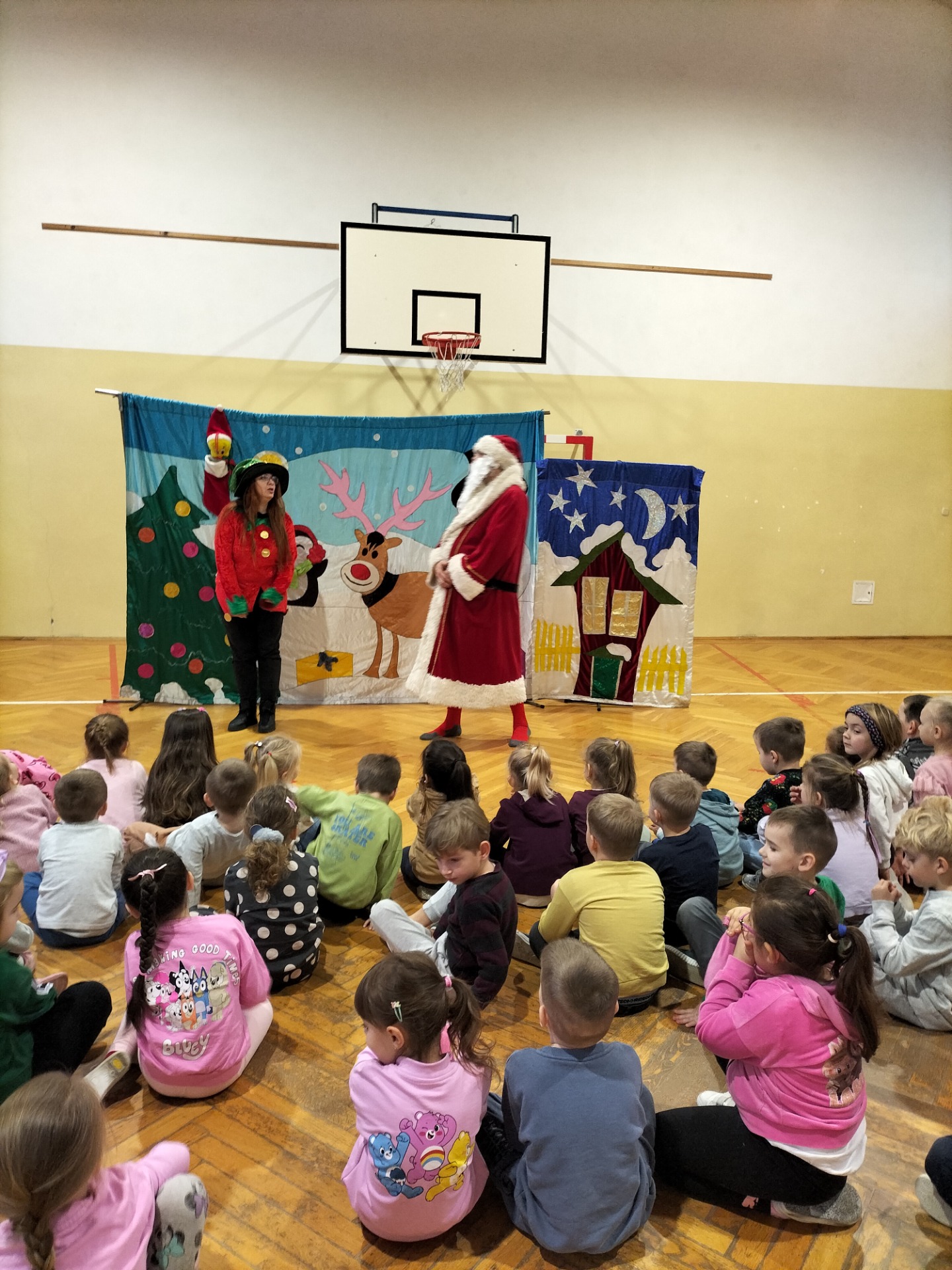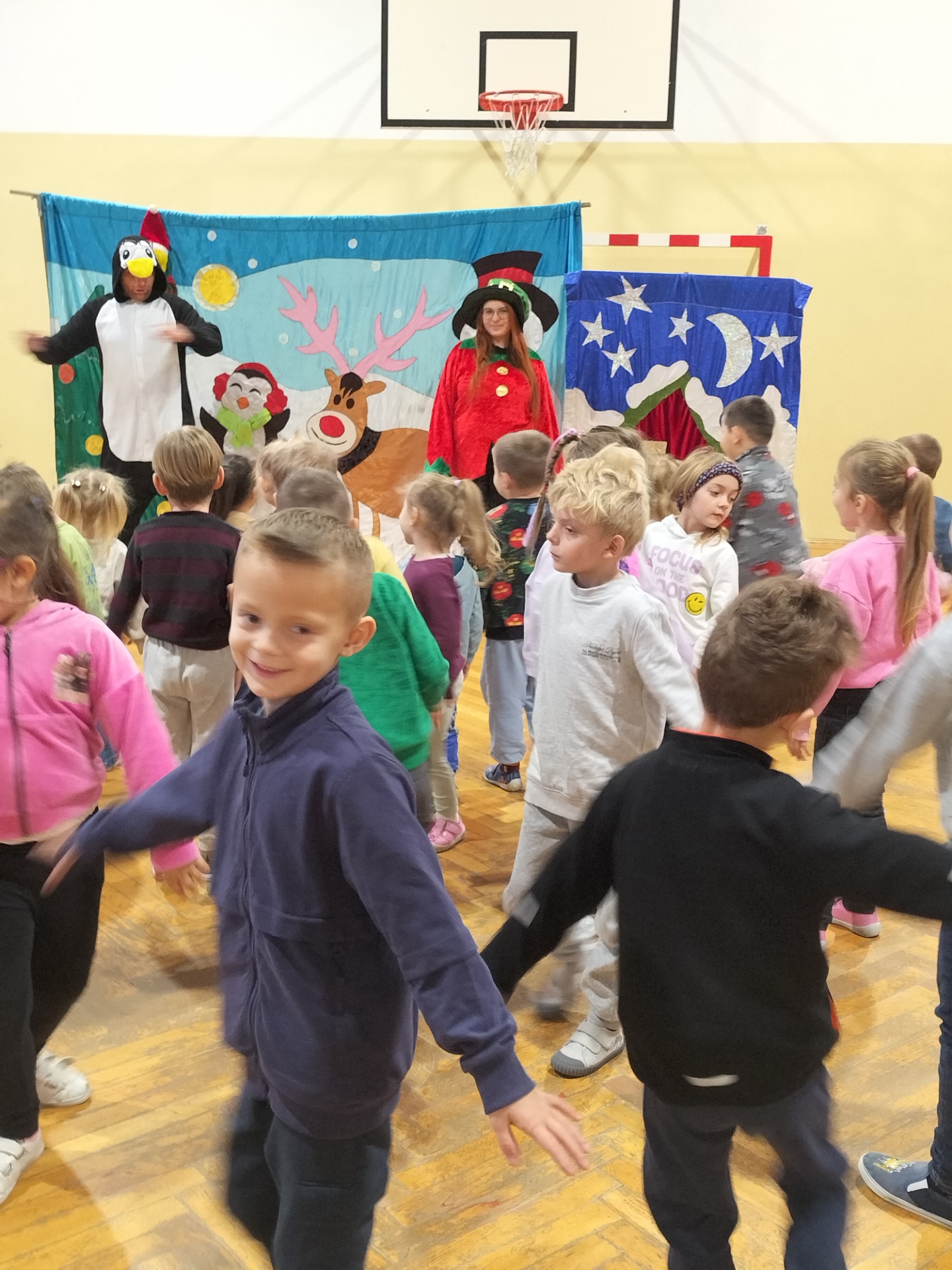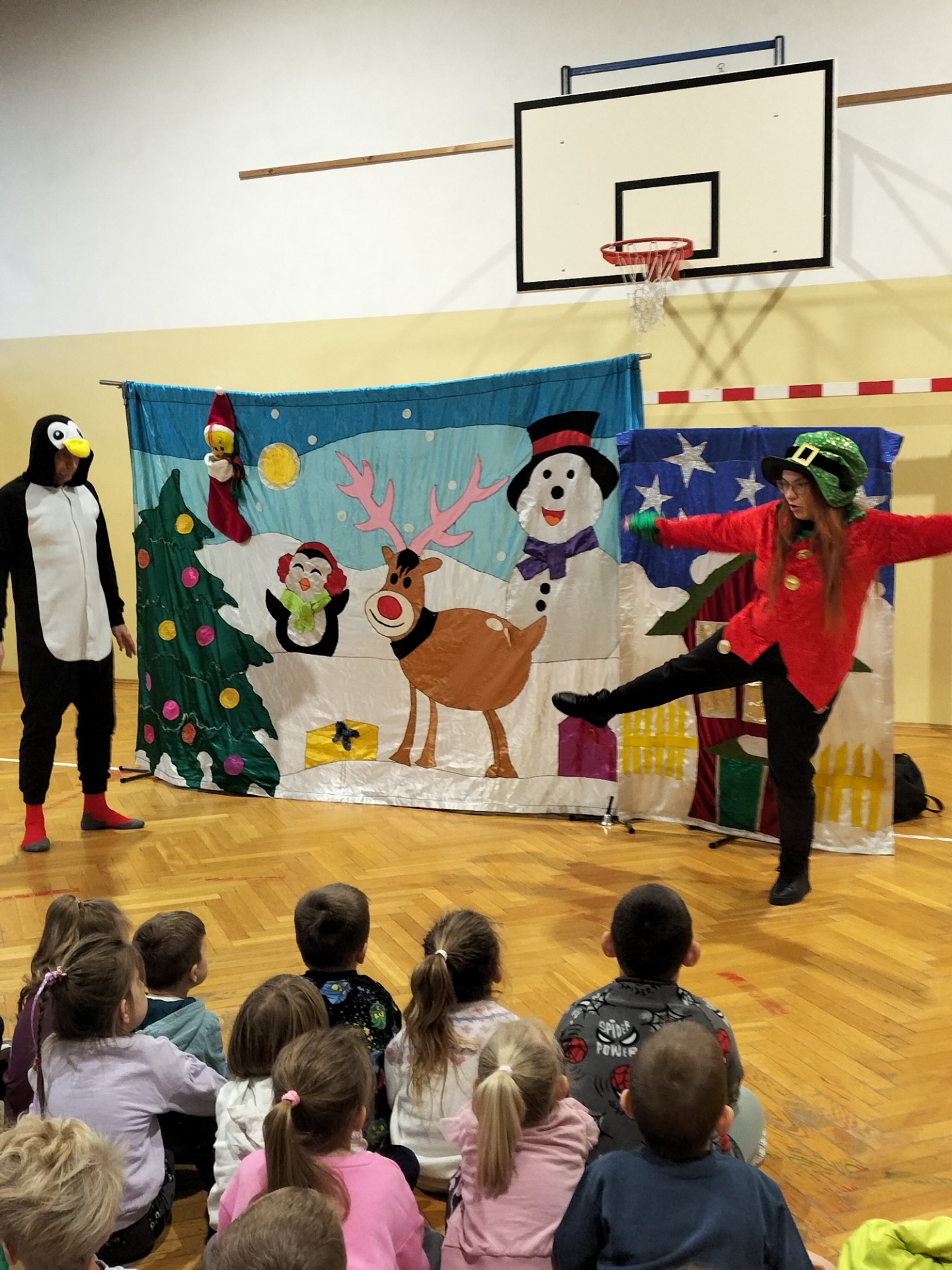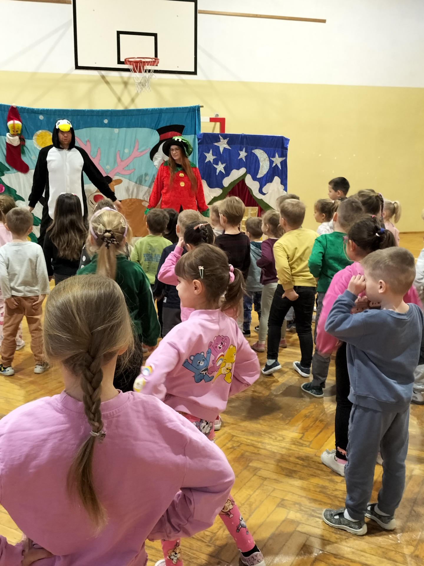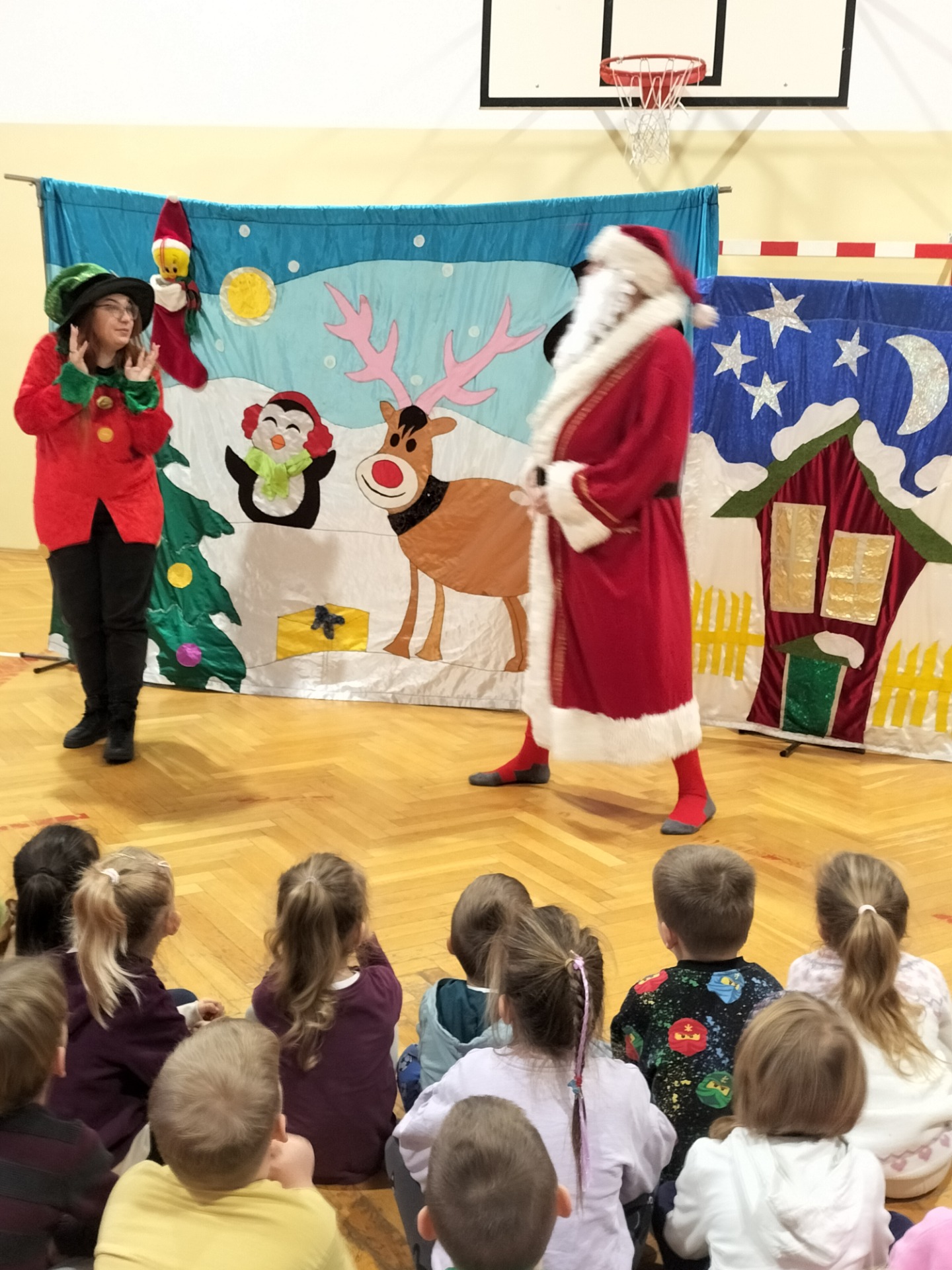 Z każdym dniem coraz bliżej do świąt Bożego Narodzenia. Każdego dnia wprowadzamy dzieci w radosny, świąteczny nastrój. Dzisiaj najmłodsi z naszej szkoły – 3-, 4-, 5-, 6-latki obejrzały przedstawienie pt. „Mikołaj w opałach” w wykonaniu aktorów teatru z Białegostoku. Dzieci z zaciekawieniem śledziły losy Mikołaja, a uśmiechy na twarzach były najlepszym dowodem na to jak bardzo się im podobało.