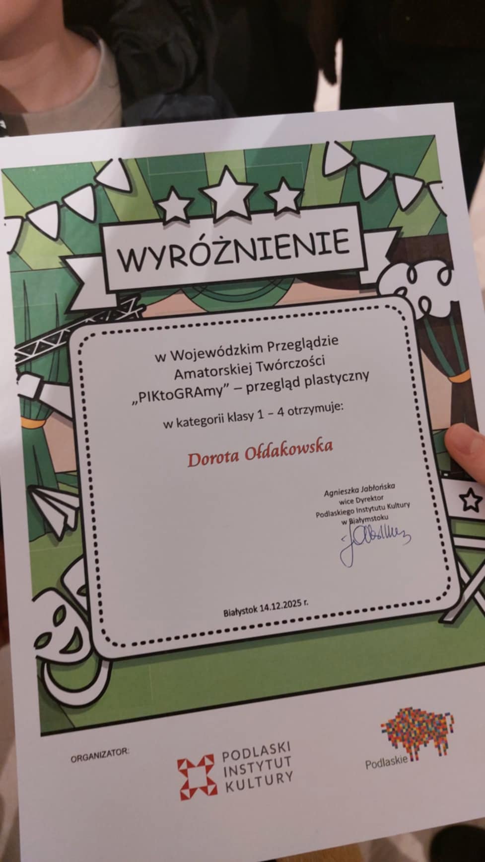 Uczniowie naszej szkoły wzięli udział w wojewódzkim przeglądzie plastycznym, realizowanym w ramach programu „PIKtoGRAmy” przez Podlaski Instytut Kultury. Była to wyjątkowa okazja, by zaprezentować swój talent, wyobraźnię i artystyczną wrażliwość, a także zainspirować się najbardziej rozpoznawalnymi symbolami regionu – muralami „Dziewczynki z konewką” i „Chłopca z tkaniną”. Temat przeglądu brzmiał: „Kompan chłopca lub dziewczynki z muralu”. Uczestnicy stworzyli własną wizję postaci – przyjaznego towarzysza, symbol lub stworzenie, które mogłoby dołączyć do bohaterów murali. Praca uczennicy klasy IV, Doroty Ołdakowskiej została dostrzeżona przez jury i otrzymała wyróżnienie w tak prestiżowym konkursie. Gratulujemy!!!
